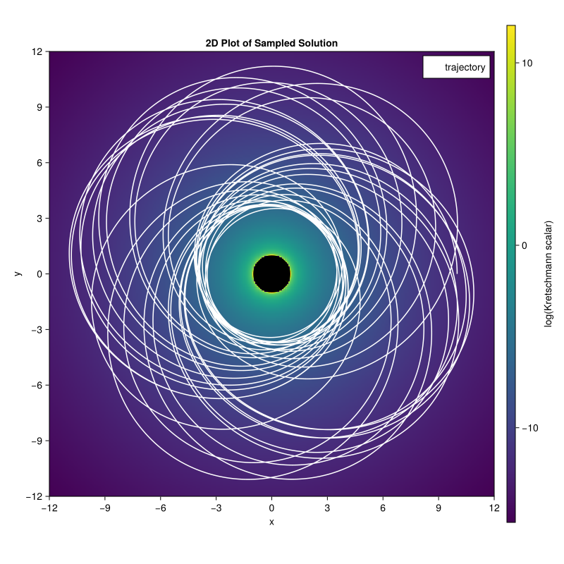 sampled_solution = sol(range(0.0, final_time; length=20000));We can also calculate the Kretschmann scalar and display the trajectory. Value of the Kretschmann scalar corresponds to background color.