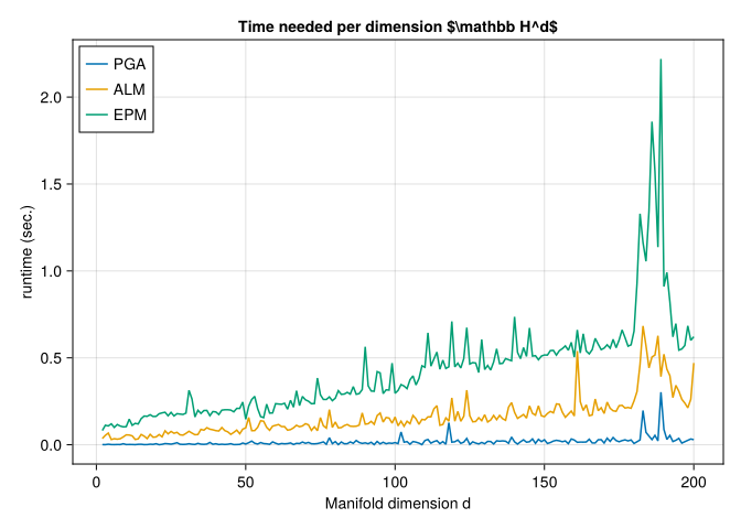 For this experiment set $\mathcal M = \mathbb H^d$ for $d=2,\ldots,200$, the Hyperbolic space and the constrained set $\mathcal C = C_{c,r}$ as the ball of radius $r$ around the center point $c$, where we choose here $r=\frac{1}{\sqrt{n}}$ and $c = (0,\ldots,0,1)^{\mathrm{T}}$ and a $σ = \frac{3}{2}n^{1/4}$.