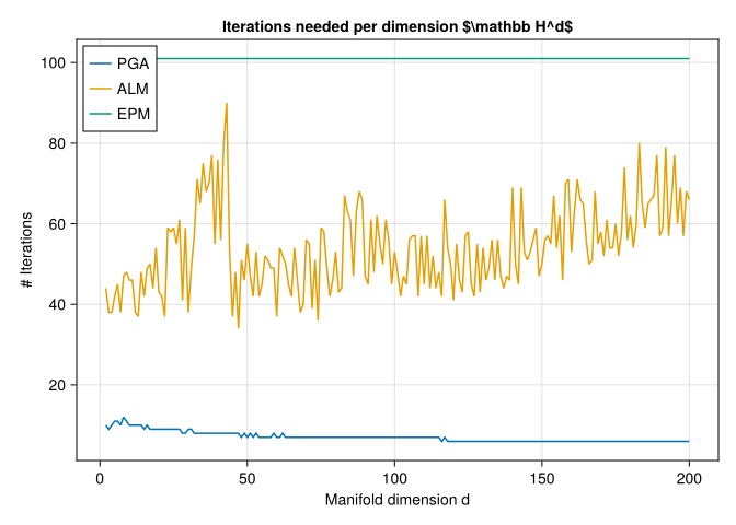 axis2 = Axis(fig2[1, 1]; title=raw"Iterations needed per dimension $\mathbb H^d$")