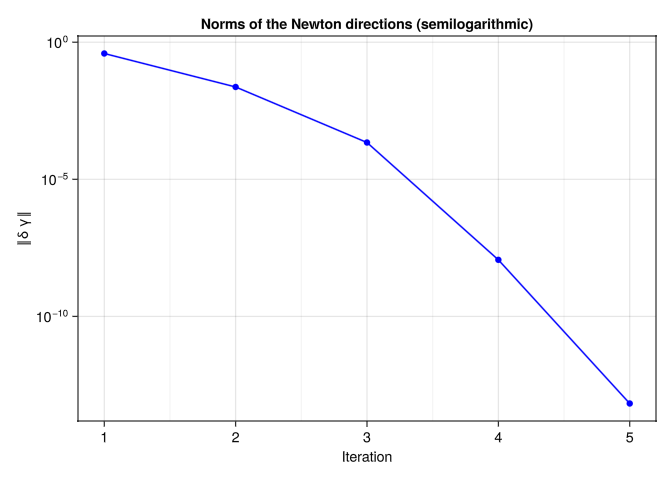 [0.38620728105387553, 0.09533087331847828, -0.9174725939521623]and plot the result, where we measure the norms of the Newton direction in each iteration,
